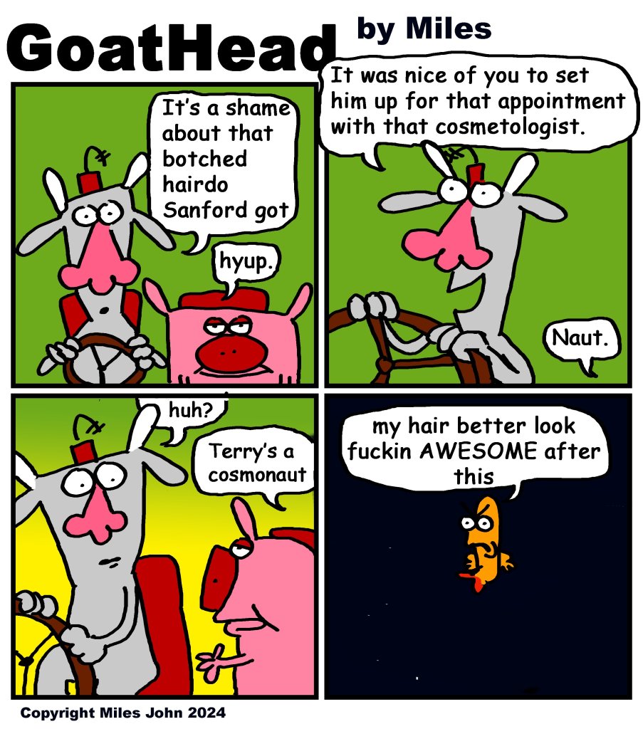 Hair Today, Fish Tomorrow Posted on August 9, 2024 by Miles John Goat Head #118 – Copyright 2024 Miles John Share this: Click to share on X (Opens in new window) X Click to share on Facebook (Opens in new window) Facebook Like Loading... Related